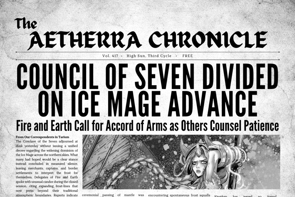 The Aetherra Chronicle is an in-world newspaper that reports on what’s happening across Aetherra—the floating-island realm inside True North. It’s written like real news from that world, covering events, rumors, conflicts, and key figures to introduce new readers to the setting and tone before the comic launches.
